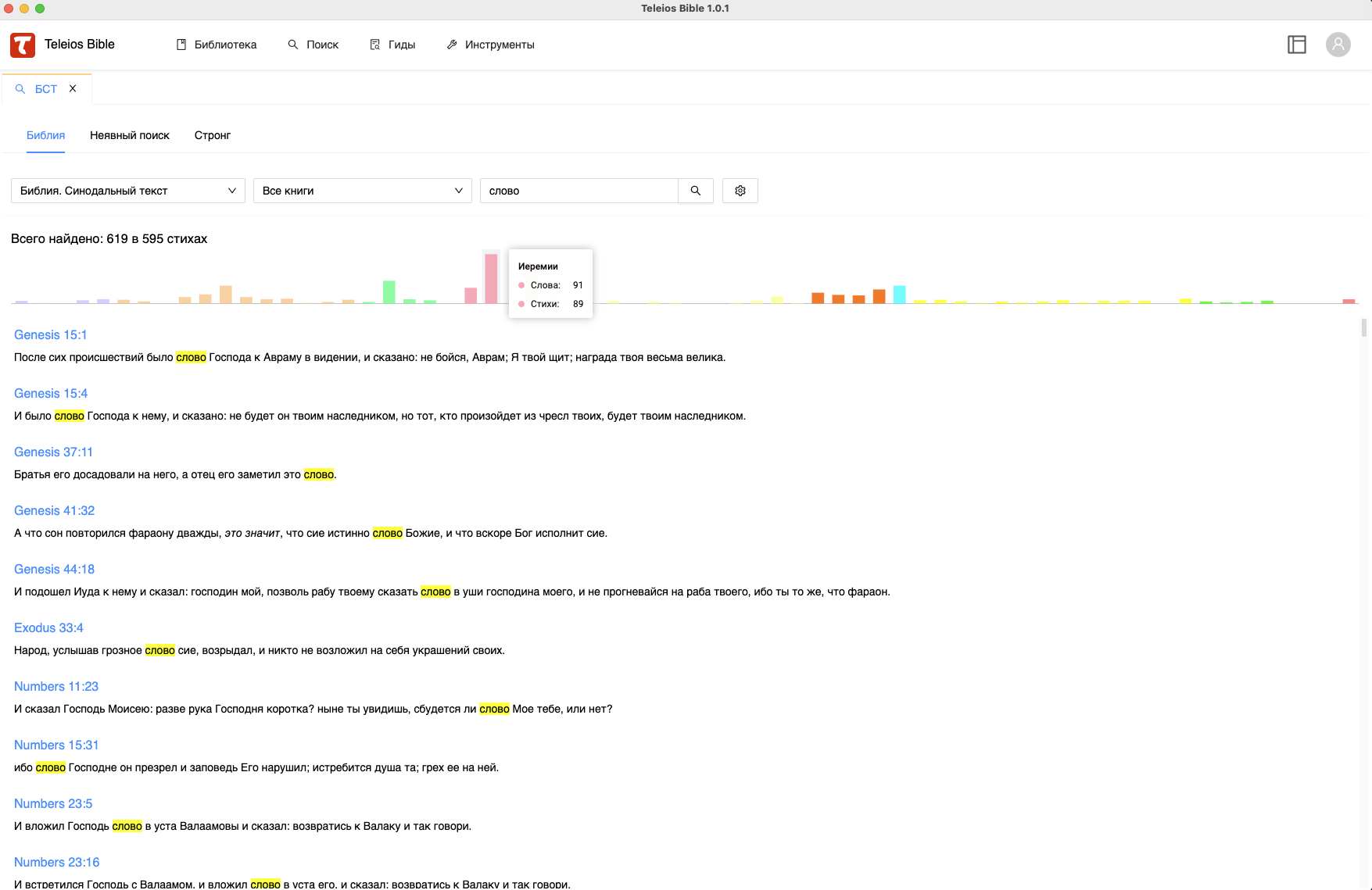 Teleios позволяет искать в выбранном переводе Библии, отображая результаты поиска по каждой книге в удобном графике.