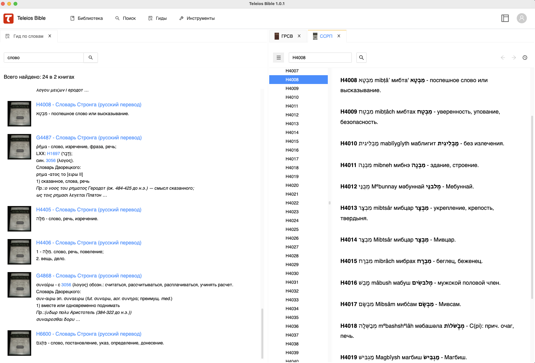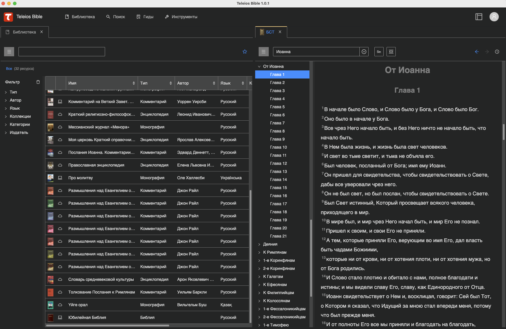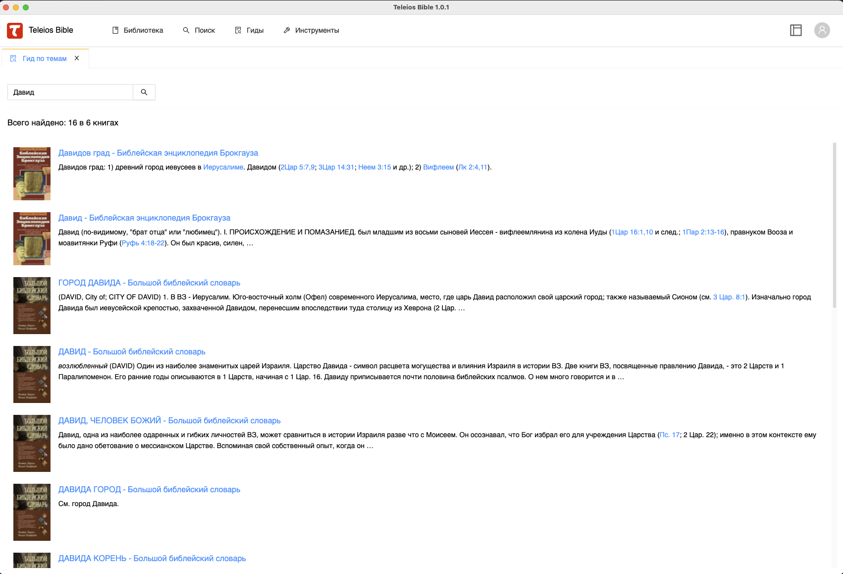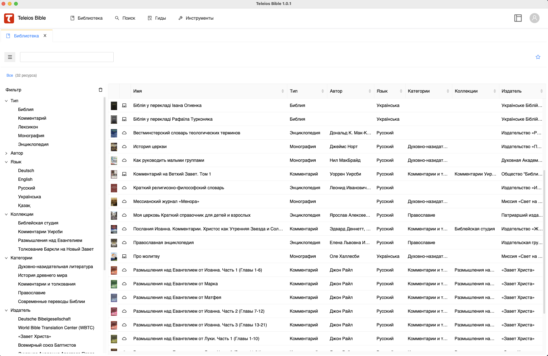 Библиотека ресурсов предоставляет возможности поиска, фильтрации и сортировки Библий, комментариев, энциклопедий, лексиконов и книг. Механизм приоритезации ресурсов позволит получить доступ к любимым ресурсам быстрее.