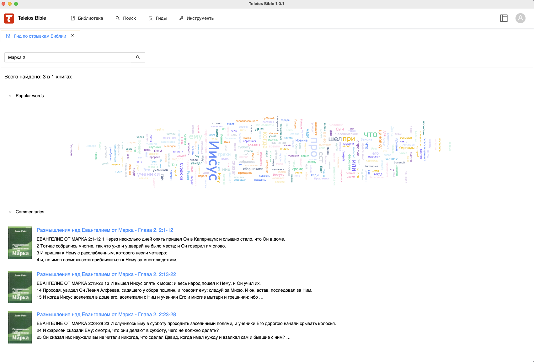 Гид по отрывкам Библии позволяет получить отчет на основании доступных комментариев. Дерево слов также поможет увидеть наиболее встречающиеся слова в искомом отрывке.